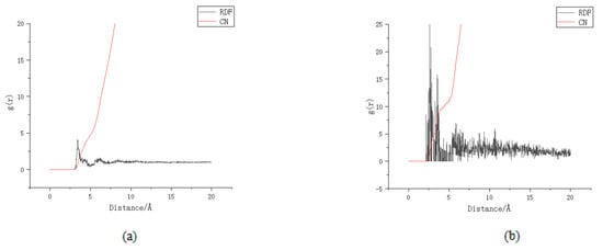 After the aluminium substitution, the calcium-silicon ratio also increases, and the ratio of interlayer free Ca2+ also increases, leading to an increase in the zeta potential of C-A-S-H; the change in potential will also lead to a change in the coordination number. After Al substitution, the charge of the whole model is no longer balanced due to the lack of a positive charge before substitution. In order to compensate for the missing positive charge, there will be a redistribution of free Ca2+ positions in the model. As a result, the physical adsorption of the chloride ions is affected, Figure 8a,b shows the coordination number before and after Al substitution.