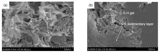 The ITZ is an important factor influencing the adsorption of deleterious ions on concrete. Previous studies have shown [35,36,37,38,39,40,41] that the addition of mineral admixtures with different physical and chemical properties can effectively improve the microstructure and reduce the influence of the ITZ on the transport performance of concrete. In order to study the influence of the lithium slag with a high aluminium admixture on the interfacial transition zone, the 150 × 150 × 150 mm test block was cured according to the standard, cut by tools, and the smooth interface separating the aggregate and mortar was sieved as a specimen, then the specimen was observed using SEM technology. Figure 10 shows the SEM images of the microstructure of the interfacial transition zone with a lithium slag content of 0%, 10%, and 20% in different regions.
