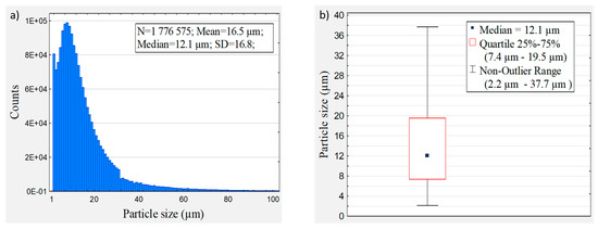 Wood dust histogram of particle size distribution (a) and boxplot of particle size distribution (b), where lower and upper quartiles appear as a box, min. and max. non-outlier values appear as whiskers, and outlier values are not shown. The size and quantity of wood dust particles were evaluated using the Morphologi® G3/G3-ID particle characterisation system.
