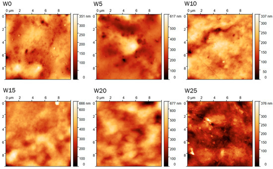 AFM scans (10 µm × 10 µm, height) of the films with wood dust content.