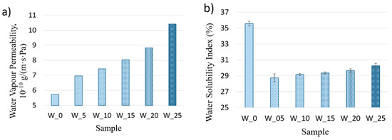 However, wood dust particles can form an insoluble barrier for the starch matrix. Therefore, fortifying the biopolymer matrix with the addition of pine wood dust reduced the solubility of the obtained biocomposites. Figure 3 shows that the increase in the amount of additive decreases the films’ vapour barrier properties.