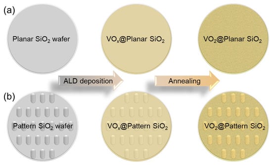 Ultimately, the as-prepared vanadium oxide@planar/pattern SiO2 thin films are annealed at 550 °C for 4 h. The ramp rate of the annealing furnace is 1 °C/min, and the gas flow rate of Ar is 50 sccm. During the annealing process, the pressure of the furnace is stabilized at 4.0 mbar by manipulating the vacuum pump. The schematic diagram of the preparation processes of vanadium oxide@planar/pattern SiO2 nanostructure is shown in Figure 2.