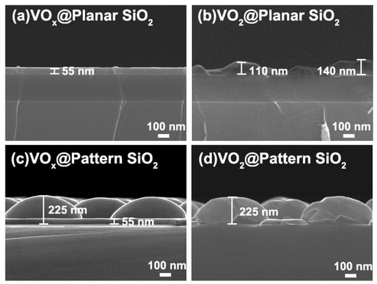 Figure 4 shows the cross-sectional morphologies of the samples, which further certify the film’s uniformity prepared by atomic layer deposition, as well as full cladding of the dysmorphism architecture. Figure 4a displays the fracture surface of VOx@SiO2 with a uniform thickness of approximately 55 nm, indicating a deposition rate of 0.016 nm/cycle. After the annealing process, the VO2 crystal stripe shows heterogeneous morphology with a thickness of approximately 100 nm, just as shown in Figure 4b. For the sample of VOx@pattern SiO2, the periodic structure of pattern SiO2 is well preserved and has equal altitude. The thickness of VOx on pattern SiO2 is 55 nm, which is consistent with that on planar SiO2, indicating that the deposition rate is only related to the source material and has no selectivity towards the basement structure. The gauge of pattern SiO2 does not change significantly before and after annealing; both are approximately equal to 225 nm, as revealed in Figure 4d. It is notable that the height of pattern SiO2 is basically homogeneous, which means that the VO2 still maintains a uniform thickness after the crystallization procedure due to the stress between the interface of crystal VO2 and pattern SiO2.