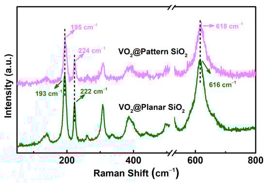 The Raman spectra confirm the existence of the stress, as shown in Figure 5. After the annealing process, the specimen reveals typical characteristic peaks of VO2 (olive line); the peaks located at 193 and 222 cm−1 represent V-V dimer vibration, with the peak at 616 cm−1 being the vibration peak of the V–O bond. Compared to the sample of VO2@planar SiO2, the Raman peaks of VO2@pattern SiO2 show a tiny blue shift (light magenta line), with characteristic peaks of 195, 224, and 618 cm−1, respectively, indicating the existence of internal stress on the interface about VO2 and the pattern SiO2 substrate. The Raman shift reasonably explains the appearance of trace surface shrinkage of VO2@pattern SiO2 during the annealing crystallization process.