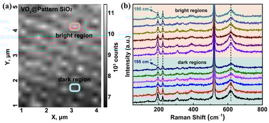 Since it is well known that the phenomenon of stress concentration is unfavorable for the application of materials in fields such as optical displays and electronic components. Whether the stress is homogeneous on the sample of VO2@pattern SiO2 is rather essential and should be eliminated as possible. Further Raman surface scanning characterization with an area of 4 × 5 μm is performed in order to characterize whether stress concentration is present, just as shown in Figure 6. Figure 6a displays the intensity map at a Raman shift of 500 cm−1, in which the periodic structure of the VO2@pattern SiO2 can be identified due to the various focusing heights on the surface. The bright regions represent the protruding parts of the VO2@pattern SiO2, such as the section enclosed within the gouache frame, while the dark regions, as shown in the aqua frame, symbolize the plane zone on the contrary. By comparing the Raman spectra extracted randomly from selected points in the bright and dark regions as displayed in Figure 6b, it is found that the Raman offset occurred simultaneously on the entire sample surface without any difference. Therefore, there is no stress concentration phenomenon, and the stress distribution is uniform at the entire surface of VO2@pattern SiO2 sample. The homogenous stress distribution is of great significance for the limpid imaging of optical displays and the controllable preparation of optoelectronic components.