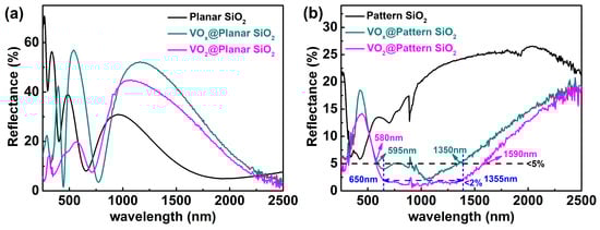 Reflectance spectra of vanadium oxide@planar/pattern SiO2 nanostructure: (a) the spectra of the planar SiO2 substrate (black line), the VOx@planar SiO2 substrate before the annealing process (dark cyan line), and the VO2@planar SiO2 substrate after the annealing process (magenta line); (b) the spectra of the pattern SiO2 substrate (black line), the VOx@pattern SiO2 substrate before the annealing process (dark cyan line), and the VO2@pattern SiO2 substrate after the annealing process (magenta line).