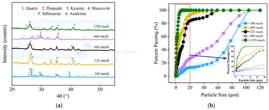 The 300-mesh CCGP contained more clinopyroxene (Figure 1a). Diopside contains 25.9% CaO, which can promote cement hydration and enhance early strength, resulting in higher strength for mortar specimens with 300-mesh CCGP compared with those with 325-mesh CCGP. Hence, the strength exhibited a “valley”. Particles in the range of 1 μm to 10 μm in CCGP are more conducive to its potential activity [25]. As depicted in Figure 1b, only the 1250-mesh CCGP had particles in the range of 1 μm to 10 μm. In the cementitious system, CCGP can serve as a physically compact filler while exhibiting higher specific surface area and better water absorption capacity with increasing mesh size. Consequently, it promotes faster hydration, thereby enhancing the early strength of the cement mortar specimens [5]. Thus, the mortar specimens with 1250-mesh CCGP exhibited higher strengths, and, based on the principle of maximum strength, 1250-mesh CCGP is preferred.