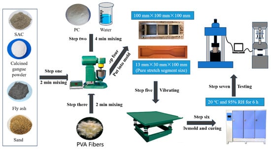 - In accordance with the mix proportions determined in Step (1), dog-bone-shaped tensile specimens were prepared, and their tensile performance was examined under standard curing conditions at 6 h. The mix proportions were optimized to achieve an ultimate elongation of no less than 0.5% and an average crack width of no more than 200 μm under uniaxial tensile loading. Figure 2 presents the flowchart for the preparation of HD-RRM.