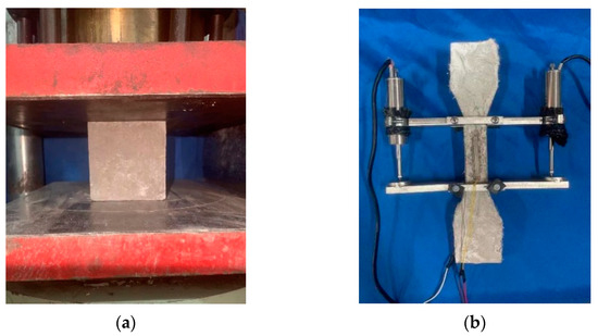 The cubic compressive strength of HD-RRM was examined using a YAW-3000D electro-hydraulic servo pressure testing machine at a loading rate of 0.5 MPa/s. The stress–strain relationship under uniaxial tensile loading was examined using a universal testing machine at a loading rate of 0.002 mm/s for dog-bone-shaped specimens with strain gauges and displacement sensors attached in the central 100 mm zone. The data from strain gauges and displacement sensors were used to obtain the stress–strain relationship curve of HD-RRM. Figure 3 presents the apparatus for testing the compressive and tensile properties of HD-RRM specimens.