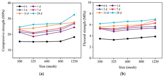 The compressive and flexural strengths of mortar specimens with different particle sizes of CCGP at various curing ages were investigated, as shown in Figure 4. In the standard curing age range of 6 h to 7 d, with an increase in the particle size of CCGP, compressive and flexural strengths of the mortar specimens exhibited a “valley” at 325 mesh, followed by an increase with further increments in particle size. In the curing age range of 14 d to 28 d, compressive and flexural strengths increased with an increase in the particle size of CCGP.