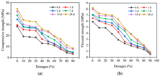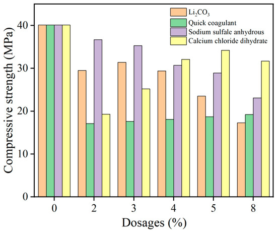 The compressive strengths and flexural strengths of HD-RRM specimens with different types and dosages of early strength agents were investigated after 6 h of curing, and the results are shown in Figure 9. The compressive strengths of HD-RRM specimens with four types of early strength agents added were lower than that of the blank control group, showing no strength-enhancing effect; instead, it significantly decreased.
