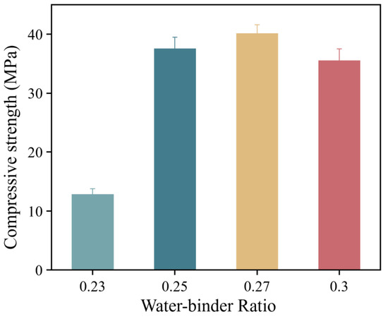 The compressive strength and flexural strength of HD-RRM specimens with different water-to-binder ratios were investigated after 6 h of curing, and the results are presented in Figure 6. As depicted in Figure 6, at a curing time of 6 h, the compressive and flexural strengths of HD-RRM specimens first increased and then decreased with an increase in the water-to-binder ratio. When the water-to-binder ratio increased from 0.23 to 0.25, the compressive strength was enhanced by 213%. However, when the water-to-binder ratio increased from 0.25 to 0.30, the compressive strength declined by 11.5%. The optimal water-to-binder ratio for HD-RRM cubic specimens was 0.27.