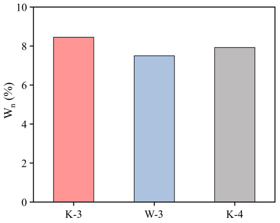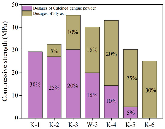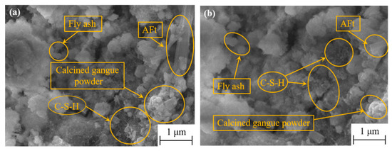 Figure 12 illustrates the morphology and microstructure of hardened cement paste in terms of K-4, W-3, and K-3 proportions after 6 h of standard curing. As depicted in Figure 12, the cement–coal gangue powder system comprised needle-like ettringite, cellular C-S-H gel, partially unreacted coal gangue powder, and FA particles. The early strength of the cement–coal gangue powder system was enhanced by the early formation of considerable ettringite, whereas the formation of cellular C-S-H gel endowed the cement–coal gangue powder system with a more compact internal structure, such that the later strength growth of the system was ensured. As depicted in Figure 12, some C-S-H gel adhered to the surface of the coal gangue powder and FA particles for the prominent pozzolanic properties of CCGP and FA [31], and they were subjected to secondary hydration in the alkaline environment provided by cement hydration, such that C-S-H gel that wrapped the surface was generated [32].