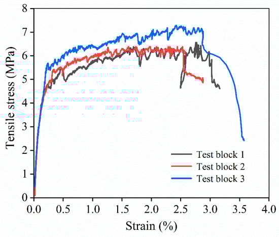 In accordance with the compressive strength test results for the cubic specimens, K-3’s proportions were identified as optimal. Tensile specimens were prepared using the above-described optimal proportions for tensile performance testing. The stress–strain relationship curve is illustrated in Figure 15, and Table 8 lists the characteristic parameters. As depicted in the above figure and table, the stress–strain curve of HD-RRM mainly had three stages, as follows. The first stage was the linear elastic stage, where stress and strain developed proportionally until the first crack appeared. The second stage was the strain-hardening stage, during which multiple cracks occurred in the material. The third stage was the strain-softening stage, where cracks further widened and extended till the specimen fractured [36]. The peak stress σt,u and peak strain εt,u represent the stress and strain values at the peak points, respectively. The initial cracking tensile strength σt,f expresses the stress value at the critical point where the stress–strain curve departs from the initial linear elastic segment. The initial cracking elongation εt,f represents the strain at the initial cracking stress, and the tensile elastic modulus Et represents the slope of the initial linear elastic segment of the stress–strain curve. As indicated by the data in the table, the ultimate elongation of this proportion was 2.75%, greater than the required minimum of 2%, and the average crack width reached 125.53 μm, smaller than the maximum allowable value of 200 μm, thus conforming to the material development target. The slag-based repair material prepared by Li Ming et al. [37] had a 3d compressive strength of 24.1 MPa; the solid waste geopolymer pavement repair material prepared by Song Luxia et al. [38] had a 3d compressive strength of 53.48 MPa. Compared to them, HD-RRM had a shorter curing time and a better compressive strength, and they did not take into account ultimate tensile strength or ultimate elongation.