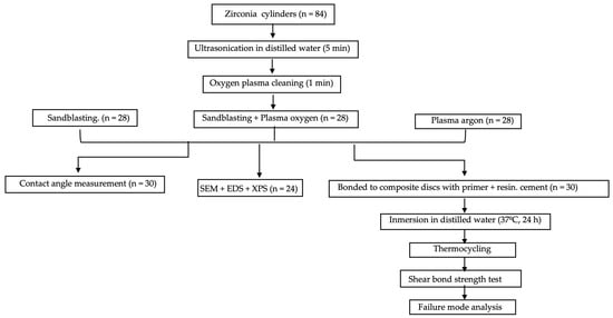 The specimens were numbered and randomly divided into 3 groups (n = 28 each), using a randomization list (www.alazar.info, 7 October 2019). The sample size was determined using a software program (G*Power 3.1.9.4, Samsøvej, Denmark) revealing a total sample size of 30 with an effect size of 0.8 at 0.8 power and a significance level of 0.05. The groups were categorized according to surface treatment: sandblasting with aluminum oxide (Zr-C); sandblasting with aluminum oxide plus plasma with oxygen (Zr-CP); and plasma argon (Zr-P) (Figure 1). Figure 2 summarizes the overall process, and the details of the treatments, and the instruments used are described in Table 1 and Table 2 and Figure 3.