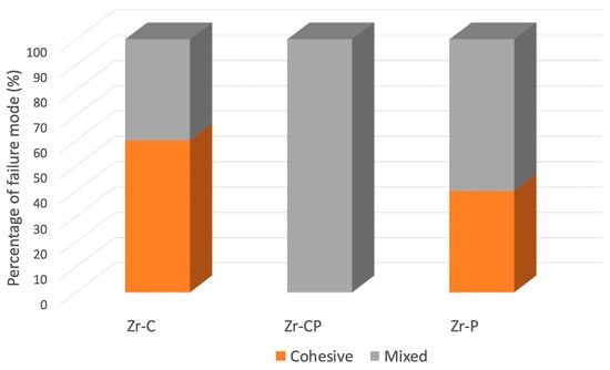 Percentage of failure mode for each group. Zr-C, sandblasting; Zr-CP, sandblasting + plasma oxygen; Zr-P, plasma argon.