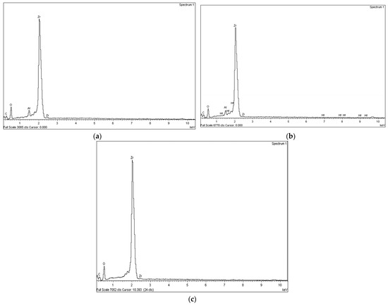 Energy Disperse Spectroscopy of zirconia surface after each surface treatment. (a) Zr-C, sandblasting; (b) Zr-CP, sandblasting + plasma oxygen; (c) Zr-P, plasma argon.