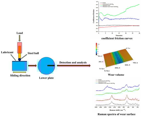 The test and analysis methods for the tribological properties of PAO6 or deionized water-based Cu(PAP)2 are shown in Figure 2. The tribological test was carried out using the China-made HSR-2 M reciprocating friction and wear tester (Lanzhou Zhongkekaihua Technology Development Co., Ltd., Lanzhou, China) and friction pairs using ball and disk contact. The test conditions were as follows: rated load: 10 N; sliding speed: 50 mm/s; test time: 30 min. The steel ball and steel disk used in the test were made of GCr15 steel, the diameter of the ball was ϕ6 mm, the hardness was HV 647-861 and the surface roughness was Ra 0.016 μm. The disk was polished before the experiment. The diameter of the disks was ϕ28 × 2 mm, the hardness was HV 300, and the surface roughness was Ra 0.02 μm. The steel ball and steel disk were ultrasonically cleaned with acetone for 15 min before and after the test, and 0.5 mL of the sample was dropped on the contact area of the specimens for each tribological test. The coefficient of friction was automatically recorded using a computer, and the wear volume of the discs was measured via three-dimensional laser-scanning microscopy (VK-X100, Keyence, Tokyo, Japan). The material compositions on the wear surface were detected and analyzed as per the Raman spectra.