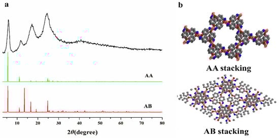 (a) Powder XRD patterns of Cu(PAP)2: obtained powder (black curve) and simulations using AA (green curve) and AB (red curve) stacking. (b) Structural representations of the unit cells of Cu(PAP)2 in AA and AB stacking, as viewed from the c axis (gray: carbon; red: oxygen; blue: nitrogen; orange: copper; hydrogen atoms are omitted for clarity).