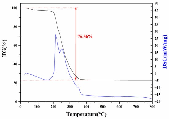 The thermal stability of Cu(PAP)2 was analyzed using Thermalgravimetric (TG) and differential scanning calorimetry (DSC). One obvious weight loss process occurred in the thermogram profile (Figure 8). The weight loss that occurred between 210 °C and 380 °C was approximately 76.56%, and this resulted from the decomposition of Cu(PAP)2 and the further oxidation of the residue under the air flow, accompanied by two strong endothermic peaks at 218 °C and 248 °C in the DSC curve. The results showed that Cu(PAP)2 had good thermal stability in air.