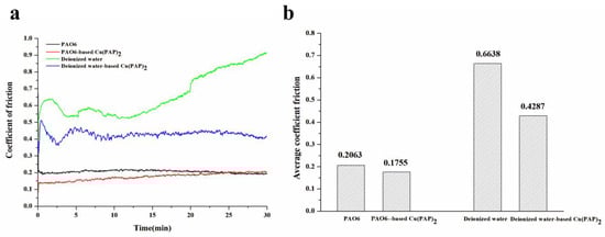 (a) The coefficient of friction curves and (b) average coefficient of friction for PAO6, PAO6-based Cu(PAP)2, deionized water and deionized water-based Cu(PAP)2.