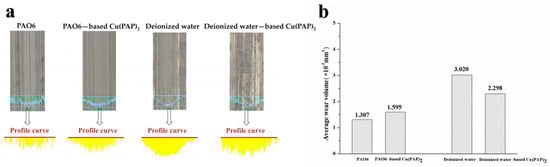The 3D worn surface topography and 2D cross-section profiles of the lower plates lubricated with PAO6, PAO6-based Cu(PAP)2, deionized water and deionized water-based Cu(PAP)2 were obtained using a VK Analyzer (Figure 10a). Compared to PAO6 and deionized water, it was clear that the average wear volume of PAO6-based Cu(PAP)2 and deionized water-based Cu(PAP)2 showed contrary results (Figure 10b). The average wear volume of the PAO6-based Cu(PAP)2 increased by 22.0% relative to that of PAO6; nevertheless, that for the deionized water-based Cu(PAP)2 decreased by 23.9% relative to that of the deionized water. The above results confirm that Cu(PAP)2 exhibits much better anti-wear behavior in deionized water than it does in PAO6.