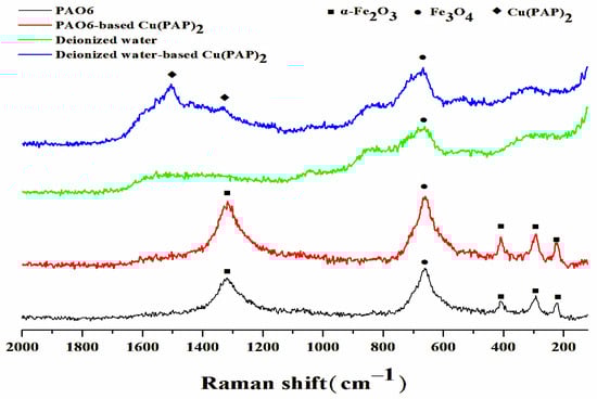 It is generally believed that the friction reduction mechanism of 2D materials based on less shearing is caused by weaker Van der Waals forces between two adjacent layers [25,26,27]. After 2D materials penetrate the interface between friction pairs, the shearing stress of friction can act on the 2D materials, and the interlayer of the 2D layered materials yields a sliding system with a lower force on the contact region of the friction pairs, thus producing less friction and wear resistance [28]. For the sake of explaining the different tribological properties of Cu(PAP)2 dispersed in PAO6 and deionized water, Raman spectra of the wear traces were detected (Figure 11). The characteristic peaks of α-Fe2O3 (292.6 cm−1, 411.2 cm−1, 222.2 cm−1 and 1319.5 cm−1) and Fe3O4 (660.8 cm−1) were all observed in the Raman spectra of wear traces lubricated with PAO6 and PAO6-based Cu(PAP)2 in relation to steel plate oxidation in the test [29]. However, the two typical peaks (D and G bands) of Cu(PAP)2 were not observed in the wear traces with PAO6-based Cu(PAP)2 used as a lubricant. Otherwise, the characteristic peaks of Fe3O4 were observed in the Raman spectra of the wear traces lubricated with deionized water and deionized water-based Cu(PAP)2, and additional D (1335.8 cm−1) and G (1503.6 cm−1) bands of Cu(PAP)2 could clearly be observed in the wear traces with deionized water-based Cu(PAP)2 used as a lubricant. The results indicated that for the PAO6-based Cu(PAP)2, Cu(PAP)2 cannot infiltrate the friction pairs in PAO6, which results in a poor tribological performance. For the deionized water-based Cu(PAP)2, Cu(PAP)2 can smoothly enter the friction pairs to bear the applied load and prevent damage to the steel plates, which leads to much better friction reduction and anti-wear behaviors.