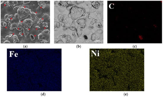 The surface morphology and element distribution of Ni–Fe–graphene composite coatings are shown in Figure 2. A large number of asperities are distributed on the compact surface. These asperities are graphene being wrapped by Ni–Fe alloy completely or incompletely being marked by red arrows (Figure 2a), which is verified further by backscatter electron image (Figure 2b) and surface energy spectrum analysis in Figure 2c–e corresponding to Figure 2b.