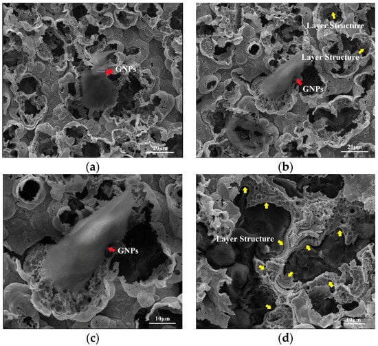In order to further prove the asperities being scattered on the surface, the Ni–Fe–graphene composite coatings were corroded in 30 vol% HNO3. The corrosion morphology is presented in Figure 3. After the surface of asperities is corroded, holes with different sizes appear and the incorporated graphene is exposed, as shown by red arrows. Simultaneously, it presents an obvious layer structure, indicated by yellow arrows, especially in Figure 3d, which is caused by incorporation of graphene.