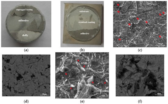Dollies were separated from between the Ni–Fe–graphene composite coating and the substrate. The separated area is equivalent to 30%, as shown in Figure 5a,b. The average value is 6.895 ± 0.159 MPa, which indicates that the adhesion strength between composite coatings and substrate is higher than 6.895 ± 0.159 MPa. Simultaneously, the morphology of the Ni–Fe–graphene close to the substrate was characterized, as shown in Figure 5c–f, after it was separated from the substrate. There are many GNPs dispersed in the composite coating, marked by red arrows, which demonstrates that GNPs are attached to the substrate surface at the initial deposition stage and then are embedded into the composite coating as the deposition process continues.