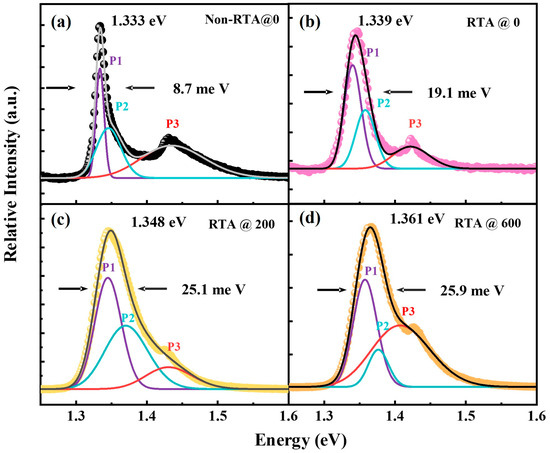 The room-temperature PL spectra and Gaussian fitting curves for (a) Non-RTA@0, (b) RTA@0, (c) RTA@200, (d) RTA@600.