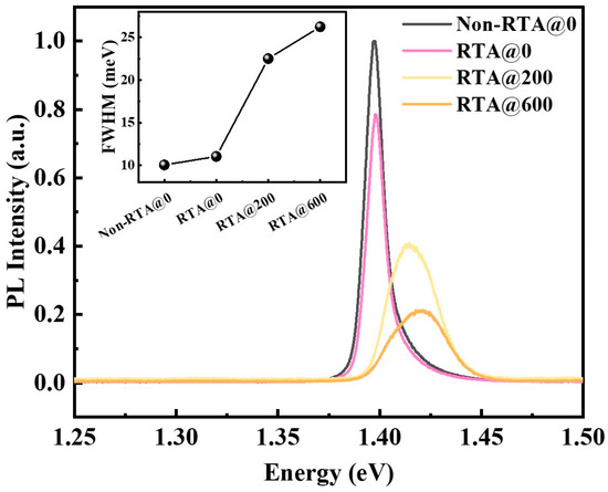 To verify the effect of interfacial atomic diffusion on the microstructure and photoluminescence properties of InGaAs/AlGaAs MQWs, all samples were measured using PL at 77 K; the results are shown in Figure 4. The peak intensity of sample RTA@0 was slightly lower as compared to that of sample Non-RTA@0, and the PL peak position was nearly unchanged. In general, the diffusion of atoms at the quantum-well interface was not activated by a short rapid annealing. In contrast, the intensity of the RTA@600 sample decreased rapidly and the half-width more than doubled under the same thermal treatment conditions. Atom diffusion at the quantum-well interface disrupts the atomic structure of the quantum well and increases the interface alloy disorder, which increases the scattering chance of carriers. The results of the 77 K PL further confirm that the introduction of the SiO2 layer can effectively enhance the mixing of interfacial atoms to tune the quantum emission wavelength.