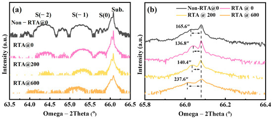 The variations in the structural characteristics and strain of the annealed MQWs with different thicknesses of SiO2 capping layers were investigated through the HRXRD spectrum, as illustrated in Figure 5. The observed clear interference fringes in the Non-RTA@0 sample suggest that these MQWs maintained excellent interfacial crystal quality and periodicity. For all annealed samples, the intensity of the satellite peak decreased and was accompanied by the disappearance of the secondary satellite peak, which indicated the slight degradation of the abrupt interface of the InGaAs/AlGaAs MQWs. Moreover, the level-zero satellite peaks of the annealed samples moved closer to and then further away from the GaAs substrate peaks based on the increasing thickness of the dielectric coatings, which means that the strain of the MQWs changed. The values of the zeroth-order satellite peak away from the GaAs peak for the four samples were 165.6, 136.8, 140.4, and 237.6 arc-seconds, respectively. The quantitative interfacial strain value in the InGaAs/AlGaAs MQWs can be calculated using the following formula [27]: