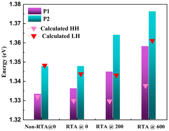 where E0(InxGa1−xAs) is the unstrained bandgap of the bulk InGaAs material, assuming that the InGaAs bandgap at 300 k follows the relation E0(x) = (1.422 − 1.53x + 0.45x2)eV, where x is the indium mole fraction [31]. Moreover, ac and av are the conduction- and valence-band deformation states, b is the shear deformation state, C11 and C12 are the elastic-stiffness constants; their offsets relative to the indium content were calculated through linear interpolation as described in Refs. [32,33,34]. Considering the effect of quantum confinement on the transition energy level of the carrier, the values of HHs and LHs in the well were calculated using the Schrodinger equation according to the boundary conditions of the wave function. Based on the above equations, the obtained transition energy levels of HHs and LHs at 300 k are plotted in Figure 6.