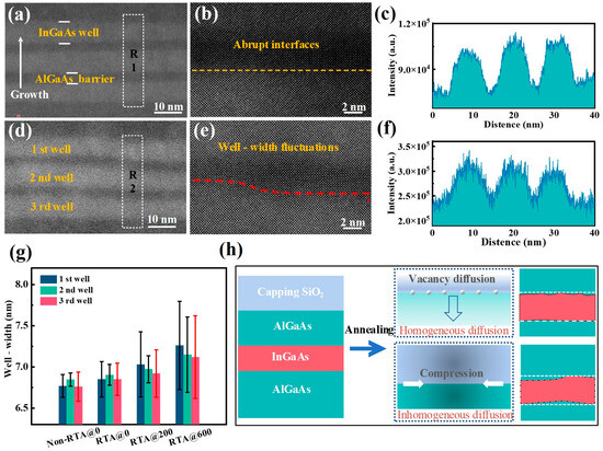 To figure out the interfacial microstructure and quality of the InGaAs/AlGaAs MQWs with a higher resolution, high-angle annular dark field (HAADF) images were plotted. Figure 7a,d show the cross-sectional HAADF images of the Non-RTA@0 and RTA@600 samples, respectively. As can be observed, the well layer and barrier layer in the as-grown sample were neatly arranged as a high-quality abrupt interface. Compared to Figure 7b, the wells fluctuated significantly, and their interfaces became gradually blurred in Figure 7e (RTA@600 nm). Figure 7c,f show the atomic column intensity profiles curves along the growth direction in the Non-RTA@0 and RTA@600 samples, respectively. These profiles show that the intensity contrast oscillations between the wells and barriers were gradually flattening, indicating that the compositional variations between the wells and barriers turned from an abrupt distribution to a gradient distribution. In addition, the well-width fluctuation penetrated from the surface to the inside of the active region and propagated vertically through the entire quantum-well structure. We expect that the width fluctuation may be caused by the nonuniform diffusion of atoms between the well–barrier interfaces. As illustrated in Figure 7g, the modulation amplitudes of the well thickness tended to decrease from the surface to the penetration direction of the substrate. Generally, the expansion of the well width causes the redshift of the PL spectrum to a certain degree; however, the diversities of the barrier and well components due to atomic diffusion and the bandgap modifications caused by the interfacial strain are also important factors affecting the PL luminescence properties. Finally, the thickness fluctuations reflect the deterioration of the optical and interfacial quality, and this is responsible for the degradation of the HRXRD satellite peaks and PL intensity.