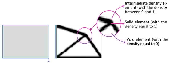 Topology optimization using a density-based method is a powerful approach to optimize the material distribution within a given design space to achieve the desired structural performance. The fundamental idea behind density-based methods is to represent the design domain using a mesh and to assign artificial density values based on the material occupying ratio within an element. The optimization process involves iteratively adjusting these density values to find the optimal distribution that meets specified objectives while satisfying design constraints. These objectives could include minimizing compliance, maximizing stiffness, reducing stress concentration, or achieving other performance criteria. The optimal artificial density ranging from 1 (solid) to 0 (void) allows for the elimination of inefficient materials, as shown in Figure 1 [2].