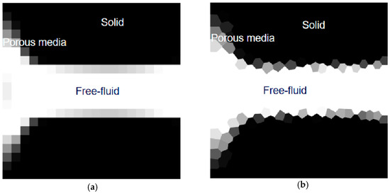 where ρ is the fluid density, u indicates the fluid flow velocity, µ represents the fluid dynamic viscosity, p denotes the pressure, f symbolizes the external body forces, and α is the inverse permeability. Based on lubrication theory, this method formed a fictitious fluid/solid domain by adding a friction term αu to the equation with the inverse permeability α, shown in Figure 2. For the steady-state problem, this equation can be transformed into a time-independent equation by removing the first term at the left of the equations. For the Stokes flow problem, the inertia term can also be neglected because it is much smaller than the viscous forces.