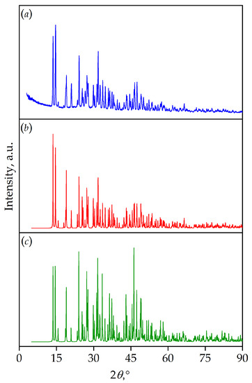 Single-crystal X-ray studies were carried out using an Xcalibur diffractometer equipped with a CCD-detector (MoKα radiation). The XRD data were integrated using the CrysAlisPro 1.171.41.119a program software [15]. Powder X-ray diffraction (PXRD) studies were carried out on a Rigaku MiniFlex-600 powder diffractometer (Rigaku Corp., Tokyo, Japan). PXRD datasets were collected in continuous mode at room temperature (CuKα radiation) in the range of 2θ = 3–90°, and a scan speed of 4° per minute.