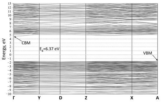 The band structure of the TmMB material was calculated to find out the electronic characteristics of the TmMgB5O10 model structure (Figure 7). The outcome of this analysis shows that TmMB is an insulator, as evidenced by the determination of an indirect energy gap of about 6.37 eV. This gap was determined by the A point at the maximum of the valence bands (VBM) and the Γ point at the minimum of the conduction band (CBM). However, it should be noted that GGA calculations have been shown to underestimate band gaps, and therefore, the experimental band gap for MgTmB5O10 may differ slightly from the calculated value. Notably, the VBM is a flat band, and the maximum values at Γ and A points in the Brillouin zone are quite close. This suggests that even a small concentration of defects in the simulated crystal structure could result in a direct band gap at the Γ point.