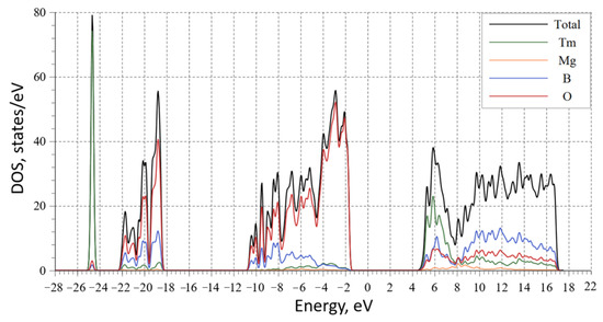 According to the calculated density of states (DOS) of MgTmB5O10 (Figure 8), the electronic structure in the energy range from −28.0 to 22 eV mainly comprises the Tm-s and O-s/p states with smaller contributions from the B-s/p and Mg-s/d/p states. The significant contribution to the lower conduction band comes from the Tm-d state, while O-s in the upper VB has a considerable effect on the dispersion.