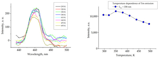 The temperature dependence of Tm3+ photoluminescence (λem = 358 nm); the right figure shows the relative emission intensity as a function of temperature.