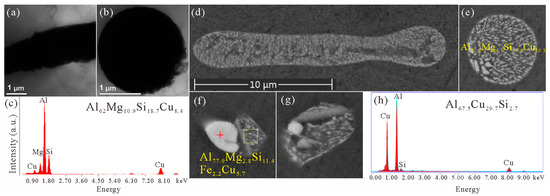 (a–c) Morphological and compositional characteristics of eutectic clusters in the as-cast microstructure of alloy #1. The two particles in TEM images (a,b) are both enriched in Al, Mg, Si, and Cu at very similar levels, and the EDX spectrum for the particle in (b) is shown in (c). The quantified contents of elements in atomic fractions are also given in (c). (d–h) Morphologies and compositions (in at. %) of eutectic clusters in the as-cast microstructures of (d,e) alloy #2 and (f–h) alloy #3, respectively. The EDX spectrum in (h) is from the position marked by a red cross in (f). The four BSE images (d–g) share the same scale bar.