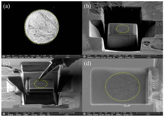 FIB preparation processes of a plane-view TEM sample from the surface of an SEM sample of alloy #1. (a) An end-on eutectic cluster was observed, and (b) Pt was deposited on this area and nearby areas were milled with the ion beam. (c) Then, this surface area was welded onto an Omniprobe nanomanipulator using Pt deposition and separated from the substrate sample by the ion beam. (d) Finally, this extracted thin sample was moved and welded onto a Cu grid, separated from the Omniprobe, and further thinned with the ion beam. The yellow dashed circle denotes the edge of the cluster.