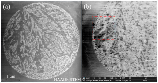Fine structures inside the TEM sample prepared with FIB. (a) HAADF-STEM image obtained in TEM. (b) Secondary electron image obtained in SEM.
