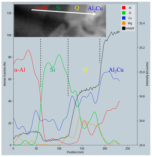 The area in the red dashed frame in Figure 4b was further analyzed with HAADF-STEM and EDX in high magnifications, as shown in Figure 5 and Figure 6 (and also Supplementary Figure S1). The four phases, from the brightest to the darkest, as denoted in the inset image and the black curve in Figure 5, correspond to Al2Cu, Q (probably Al4Cu2Mg8Si7), α-Al, and Si, respectively. This can be explained by the mass-thickness contrast characteristics of HAADF-STEM images. Al2Cu has the highest Cu content (Z = 29), while the Q phase has much less Cu. Si (Z = 14) atoms are heavier than Al (Z = 13) atoms, but the Si phase has a substantially lower density of atoms than α-Al. The Al2Cu phase constitutes the main skeleton of the dendritic cluster.