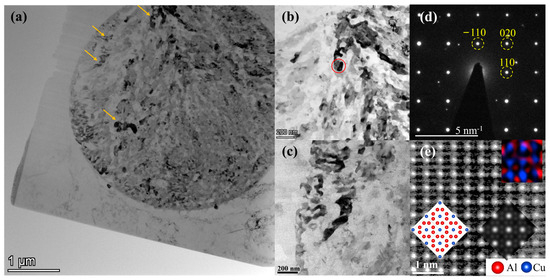 The TEM bright field and atomic resolution HAADF-STEM images shown in Figure 7 confirm that the crystal structure of the white branches in Figure 4 and Figure 5 is a tetragonal θ-Al2Cu structure, which has a I4/mcm space group and lattice parameters a = b = 6.067 Å, c = 4.877 Å according to the work of Meetsma et al. [35]. As shown in the bright field images in Figure 7a–c, when a branch is tilted to a zone axis, some other branches share the same zone axis and similarly display dark contrast. In Figure 7d, this zone axis was identified as the [001] axis of the θ-Al2Cu structure using selected area electron diffraction (SAED). This implies that different branches inside the dendrite cluster were grown on the same nucleus. It should be noted that the TEM sample surface was normal to the long axis of the cylindric cast ingot, which underwent a positive temperature gradient from bottom to top during solidification [11]. In other words, the [001] axis of these θ-Al2Cu branches was parallel to the temperature gradient. However, it is currently not known if all branches belong to approximately the same orientation or not. In other words, it is not known by how many degrees the [001] axis of each of the other branches deviates from the long axis of the cluster. In the future, a full study of the orientations of all branches using scanning precession electron diffraction or 4D-STEM would be interesting.