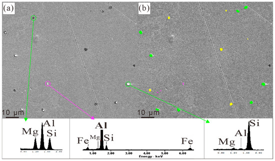 Identification and measurement of volume fractions of the particles in the homogenized microstructure of alloy #1: (a) is the secondary electron (SE) image and (b) is the processed one. Typical EDX results are shown as insets. The particles marked in (b) in green are Si particles, those marked in yellow are Mg2Si particles, and those in purple are ternary AlFeSi particles.
