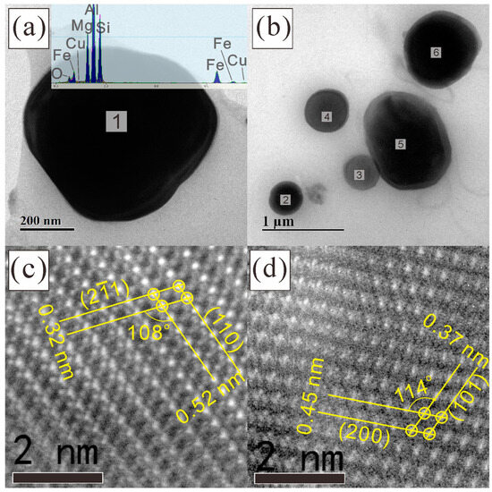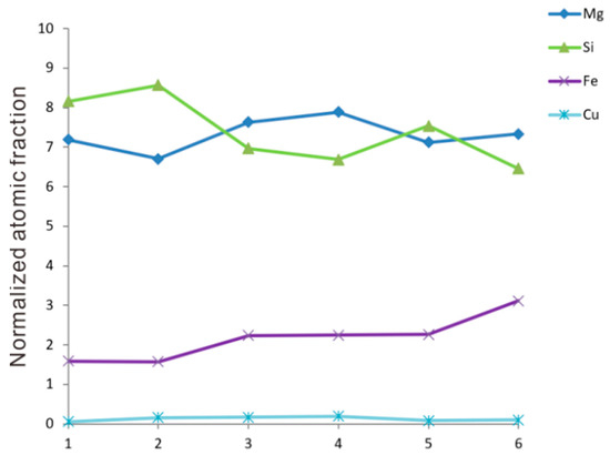 It should be noted that the EDX signals from the phases were mixed with strong background Cu signals, and even in the α-Al and Si phases there was around 13–15 at. % Cu (see the blue curve in Figure 6 and Table 3). Such background Cu signals might be from the EDX signals from the Cu grid supporting the FIB-prepared TEM lamellar sample, or from the Cu atoms that were sprayed from the Cu grid onto the sample. Therefore, the typical compositions of Q and Al2Cu listed in Table 3 were subtracted by the minimal artifact Cu content, retrieving calibrated compositions of Al10.3Cu4.3Mg8.0Si7.9 and Al1.09Cu, respectively. There are still some residual background Cu signals in both phases, and the Al content in the Q phase was influenced by the EDX signals from the neighboring α-Al matrix. In a word, unfortunately, these compositions can only be interpreted in a semi-quantitative way.