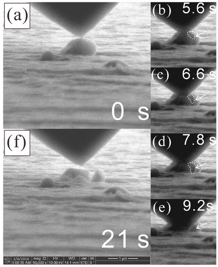 Frames captured in the in situ compressive experiment in SEM (SE mode) on an etched sample in the homogenized state: (a–f) denote different stages from the load–unload–lift-up procedure, with a total duration of 21 s. The arrows and dashed curves indicate the evolution of a crack in the particle.