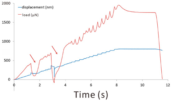 Evolution of load and displacement with time during in situ mechanical tests of the Q phase particle. The red arrows indicate the load drop events.